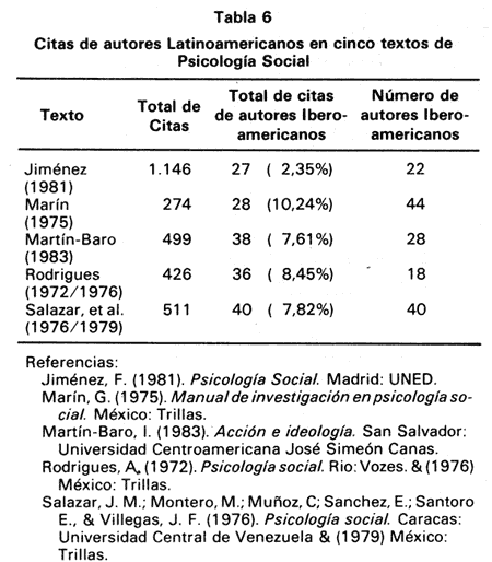 Una alternativa que se podría proponer para explicar la baja proporción de citas de autores iberoamericanos podría basarse en la idea de que no existe suficiente material autóctono además de que no es relevante el incluirlo. Para analizar esta idea, compare las citas incluidas en cinco textos de psicología social producidos en Iberoamérica en los últimos diez años. Este análisis es interesante porque de antemano sabía que los autores se habían esforzado por incluir trabajos iberoamericanos en sus obras y porque diferencias culturales son especialmente importantes en psicología social. La Tabla 6 presenta los resultados de ese análisis. Allí observamos de nuevo que la proporción de autores iberoamericanos es considerablemente más baja (5,91%) que la de autores anglo-sajones (94%).